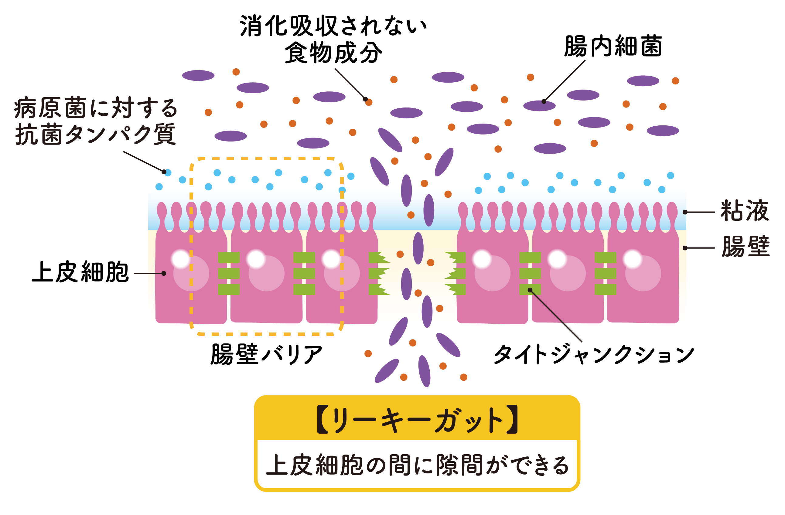 导致肠漏的成分包括小麦蛋白麸质、酒精、咖啡因和辣椒成分,但也被认为是由食物过敏、感染和肠道环境紊乱引起的。