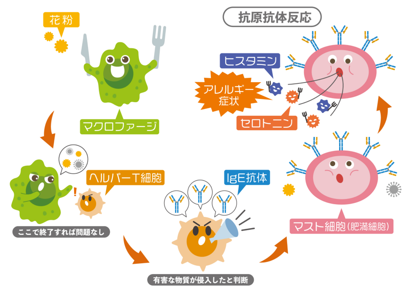 相反,IgE抗体攻击肥大细胞(脂肪细胞)。受攻击的肥大细胞会释放组胺和血清素等炎症物质,从而引发过敏症状。源自醋酸菌的脂多糖(LPS)具有抑制这些免疫细胞过度活跃的作用。因此,它有望用于预防花粉症。